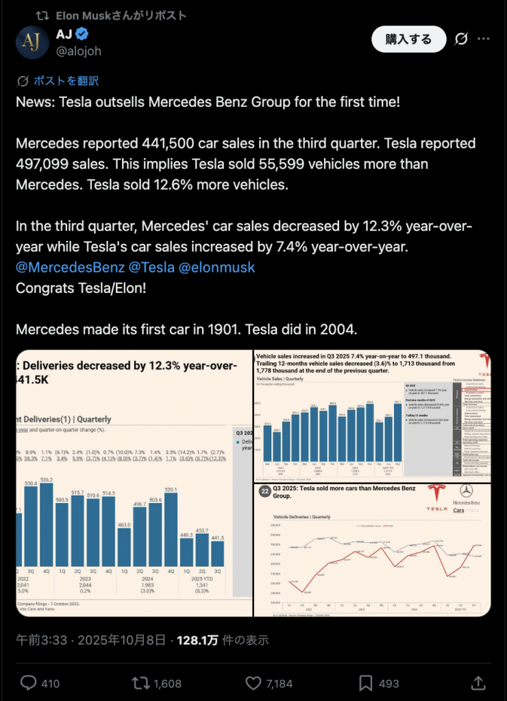 米電気自動車(EV)大手テスラは2025年7〜9月期の乗用車販売台数で、独メルセデス・ベンツを初めて上回り、高級車市場の勢力図が電動化によって再編されつつあることを示した。