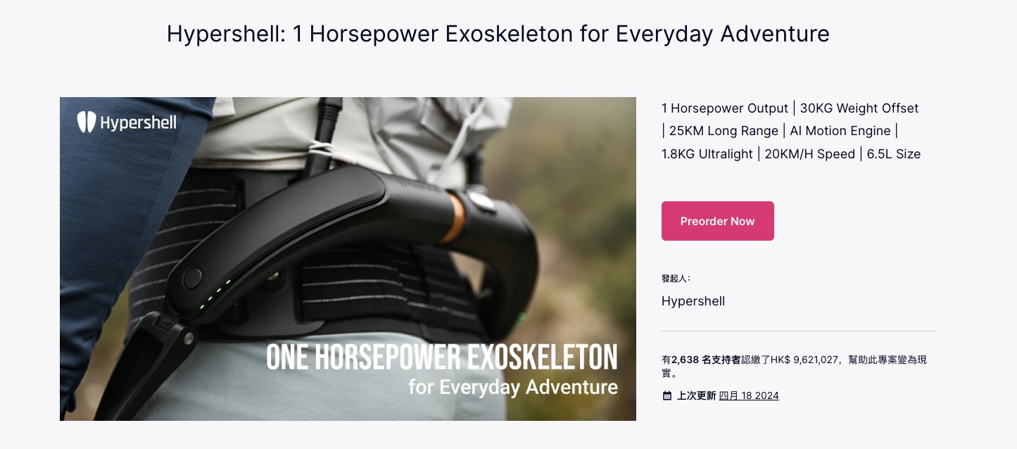 同年3月に、コンシューマ向けとしては初の外骨格スーツ「Hypershell Go」をクラウドファンディングサイト「Kickstarter」で発表したところ、2638人の支援者から123万ドル(約2億円)が集まり、その年の注目プロジェクトとなった。