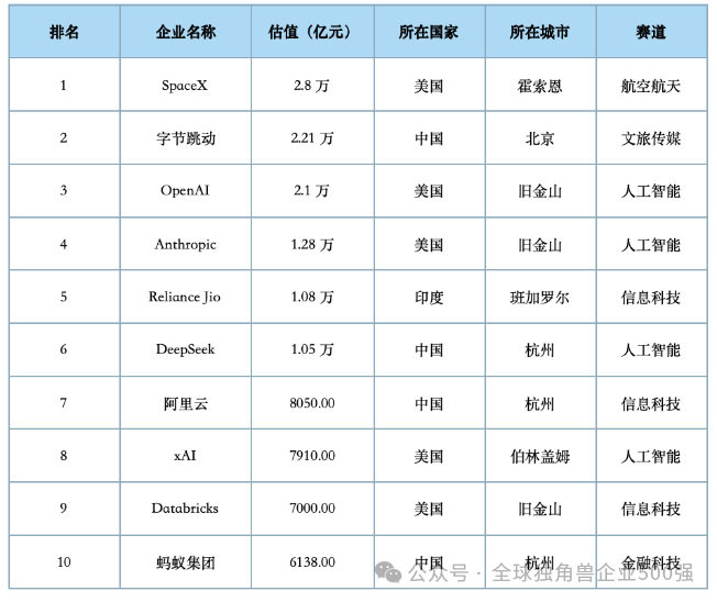 グローバルトップ3は依然としてトップテクノロジー大手が独占している。イーロン・マスク傘下のペースX(SpaceX)が2兆8000億元(63兆円)の評価額でトップ。バイトダンスがそれに続き、米OpenAIが第3位となった。