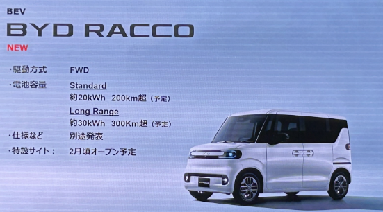 BYDは2026年上半期に営業強化と拡販を進め、期待の日本専用の軽EV「RACCO」の特設サイトを2月ごろに開設する予定で、7月ごろの発売を目指している。