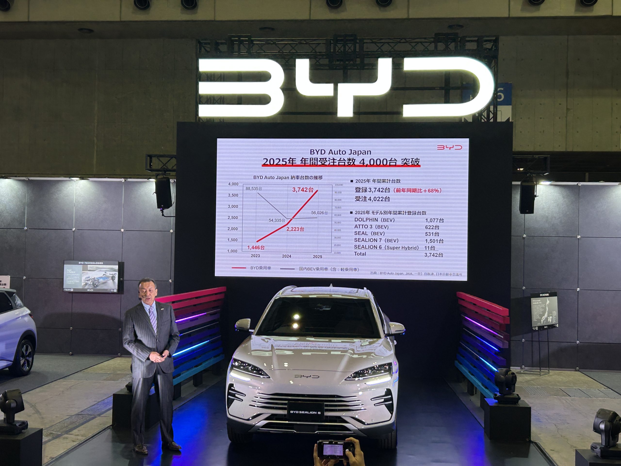 新エネ車の累計生産台数は、2025年12月に1500万台に到達。海外輸出台数は前年比約5割増の105万台と大きく伸びている。一方、日本市場での販売規模は依然として小さい。2025年の国内登録台数は前年比約7割増の3742台、SUV「SEALION 7(シーライオン7)」の販売が寄与し、年間の総受注台数は初めて4000台を超えた。