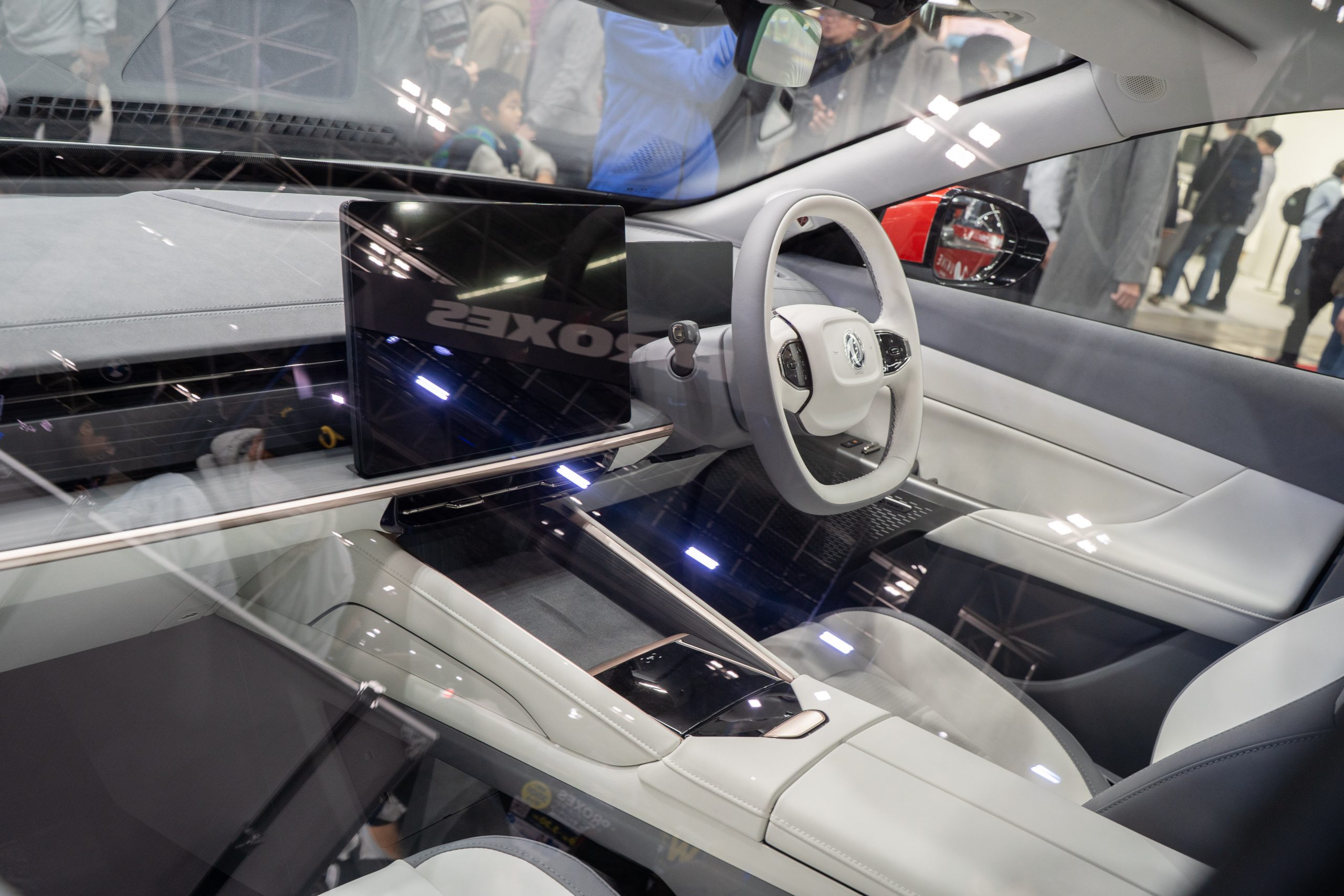 フロントグリルは中国仕様のナンバープレートホルダーを覆う形状となっており、これはフロントバンパー丸ごとを日本仕様へ改修するコストを鑑みての判断と推測される。一方で仕上がりは違和感なく、部品自体もカーボン製となっているため、スポーティ感の演出にひと役買っていると感じた。また、細かい点だと日本の道路事情に合わせて右ハンドルモデルを販売、急速充電は日本で普及しているCHAdeMO規格を採用する。