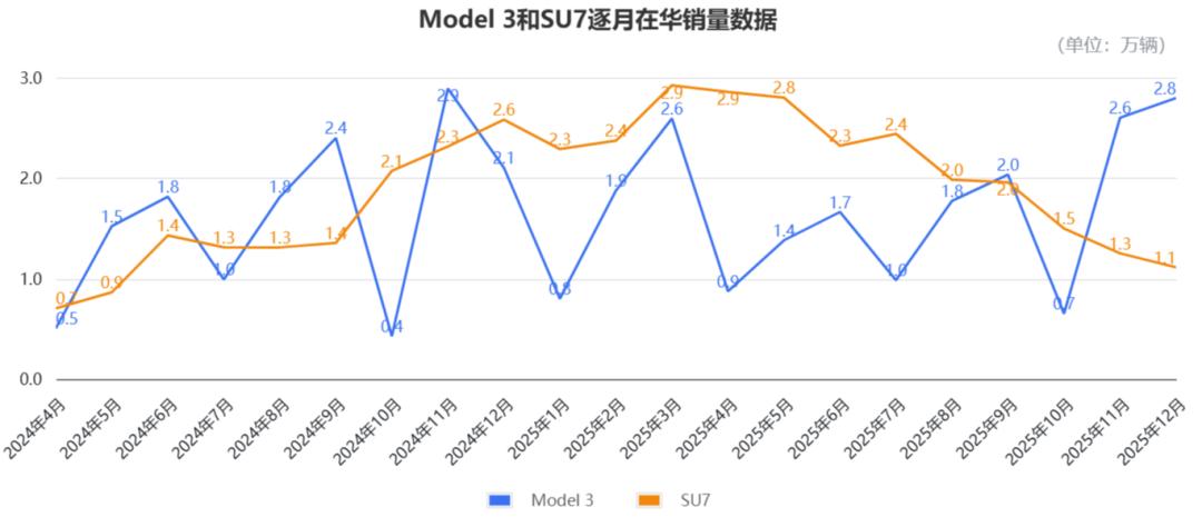 小米SU7は発売当初からテスラのモデル3を競合と位置づけていた。単月の販売台数を見ると、2024年3月の発売から25年12月までの21カ月のうち13カ月で、SU7がモデル3を上回っている。