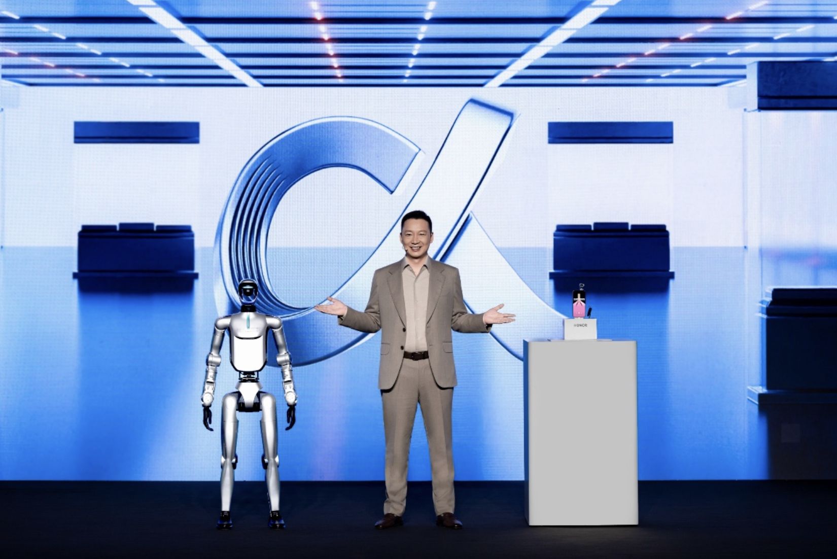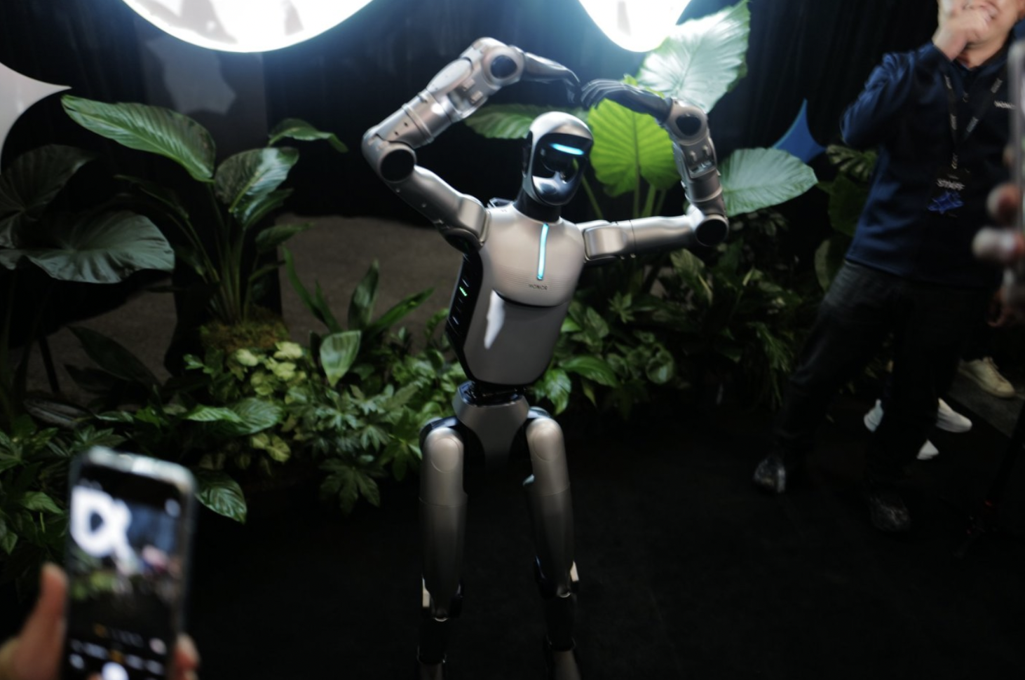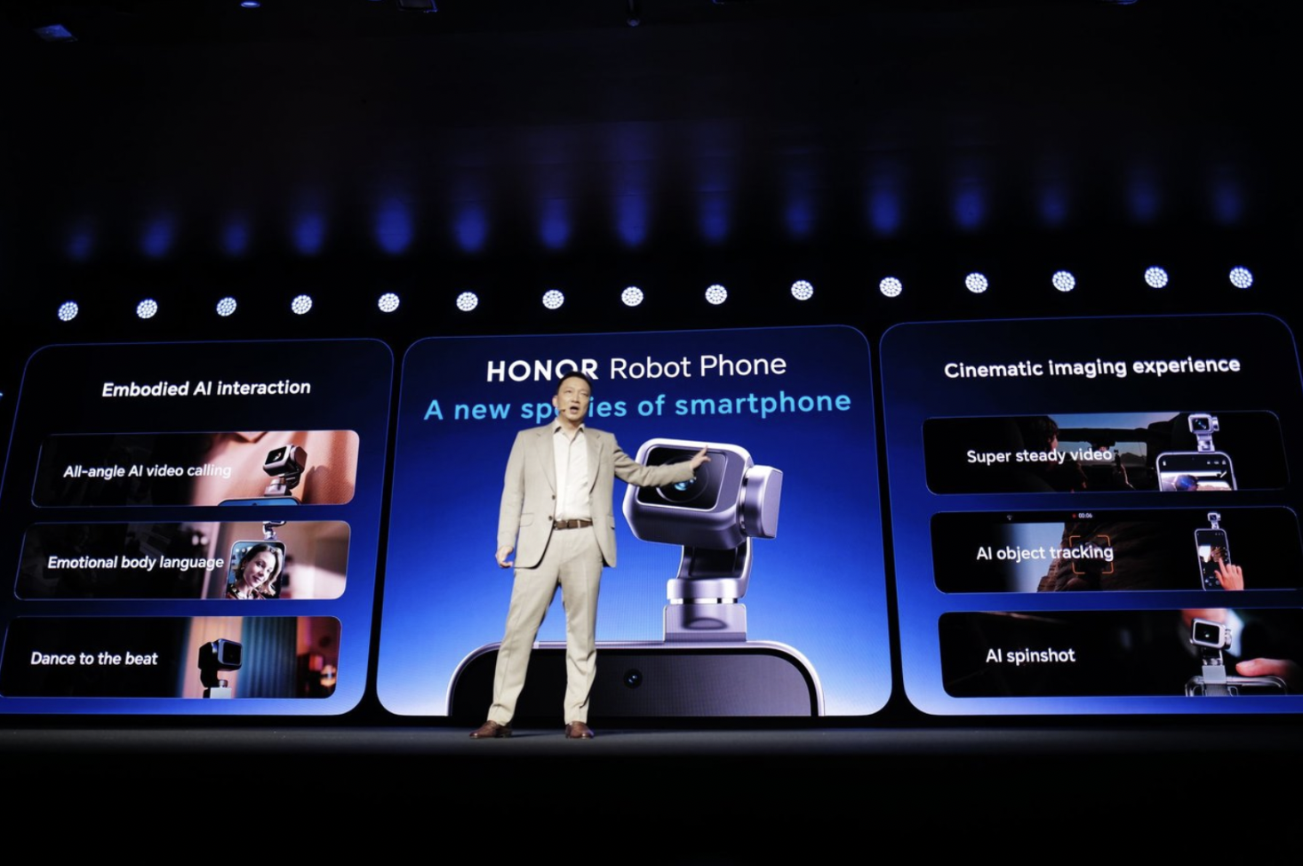 同日に発表された同社初の人型ロボット「Honor Robot」は、ステージ上でバク転を1回転きれいに決め、その後ダンスパフォーマンスを披露した。ジェームズ・リーCEOと握手する場面も演出されたが、ロボット自身は発話しなかった。代わりにRobot Phoneがロボットの「声」として会場に語りかける形をとった。