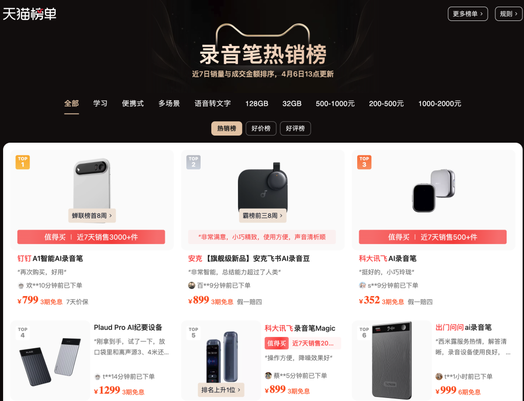 米スタートアップPlaudが2025年にカード型のAIボイスレコーダーで市場の注目を集めて以来、中国でも多くの企業が同分野に参入している。例えばアリババグループは、ビジネスツールプラットフォームの「DingTalk(釘釘)」からAI搭載レコーダー「A1」をリリースしている。